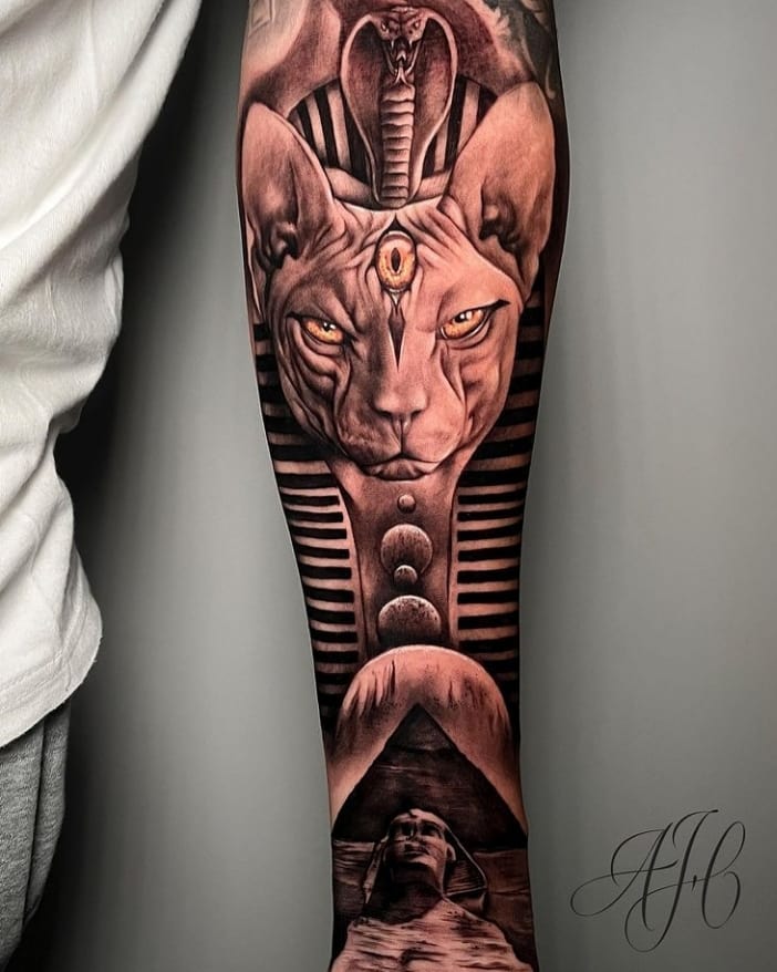 This half sleeve tattoo blends Egyptian mysticism with detailed realism. At the center, a sphynx cat with piercing golden eyes and a third eye symbolizes intuition, mystery, and divine protection.