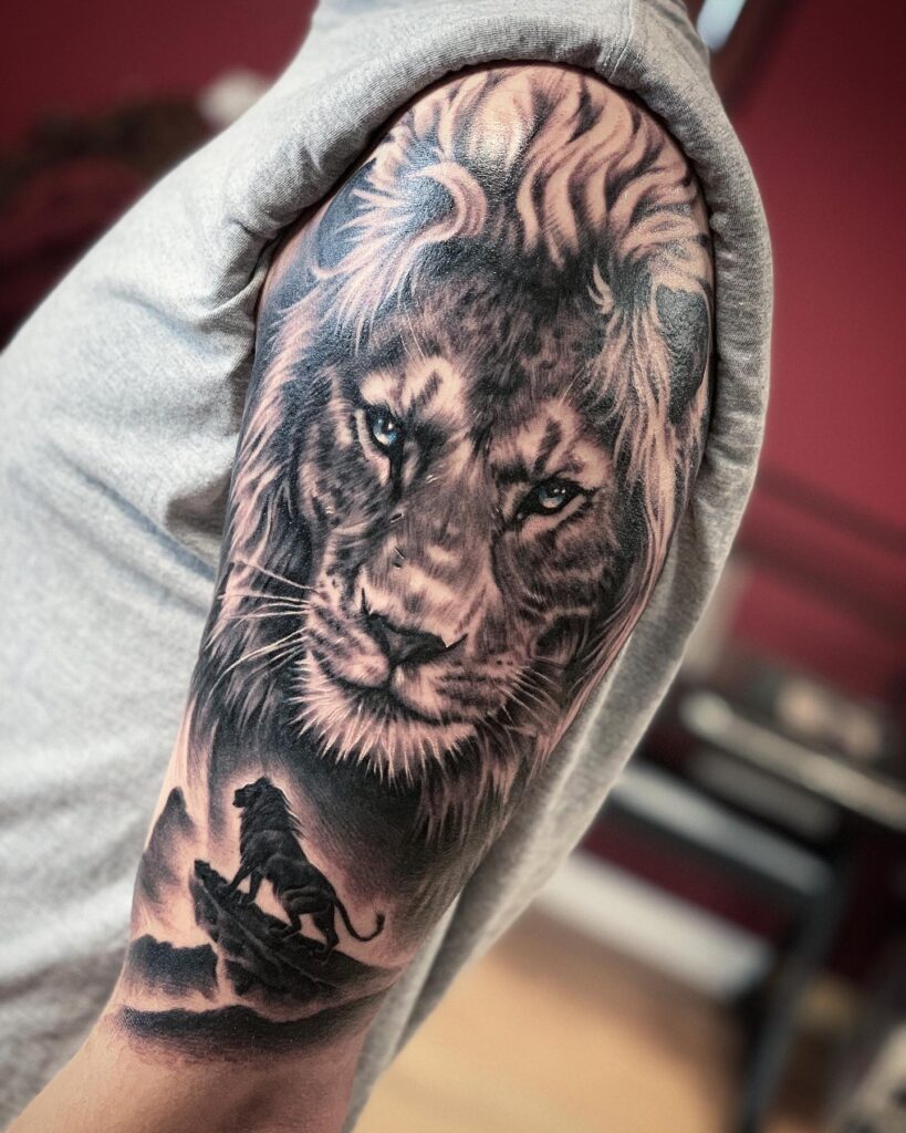 The lion’s face dominates the upper arm, with piercing eyes and a flowing mane that radiates strength and dignity.