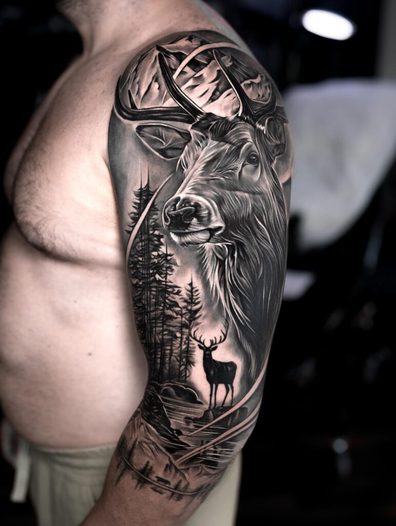 This half sleeve tattoo beautifully captures the majesty of the deer, symbolizing grace, strength, and renewal.