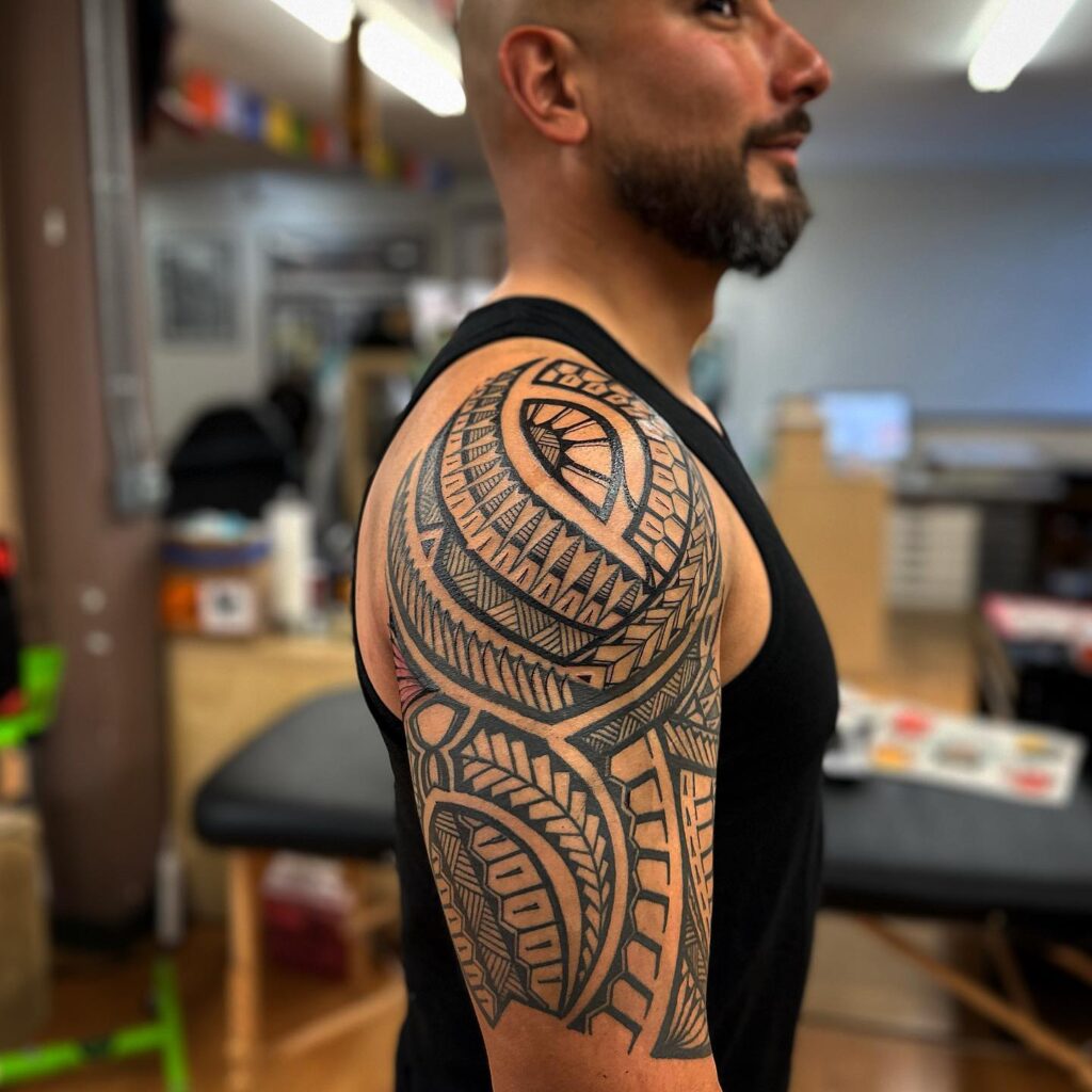The design features layered patterns with repeating triangles, curved bands, and shield-like motifs arranged in balance. Each section flows naturally into the next, covering the shoulder and upper arm with symmetry and rhythm.