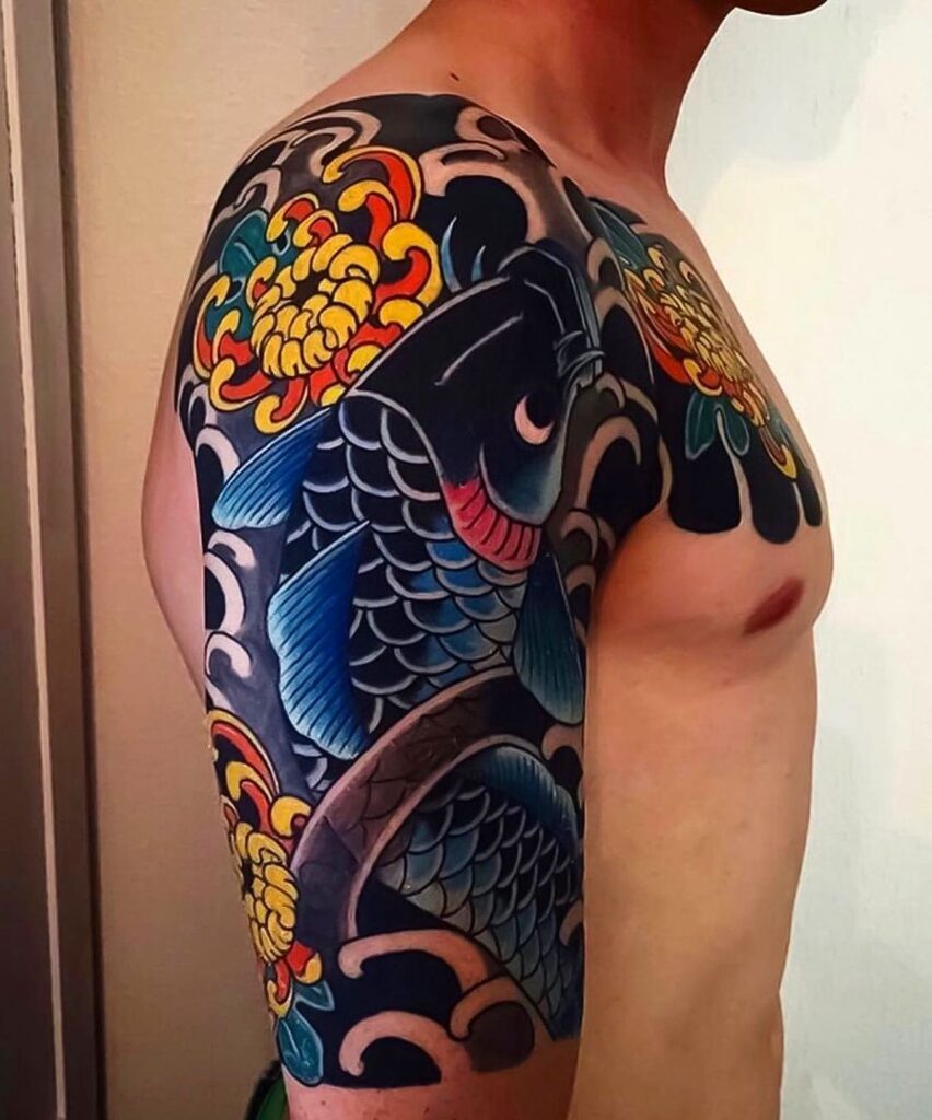 This half sleeve tattoo highlights a bold koi fish surrounded by vibrant chrysanthemums and swirling wave patterns.
