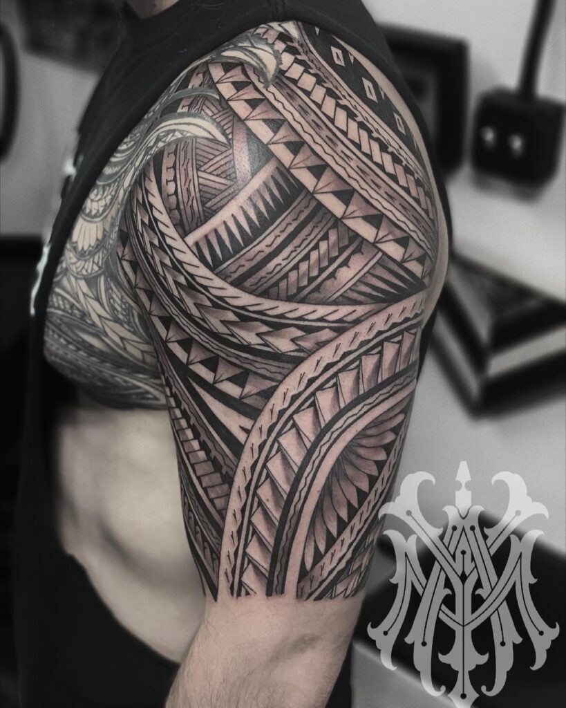 Repeating triangles, curved lines, and intricate motifs interlock seamlessly, covering the shoulder and upper arm with balance and flow.