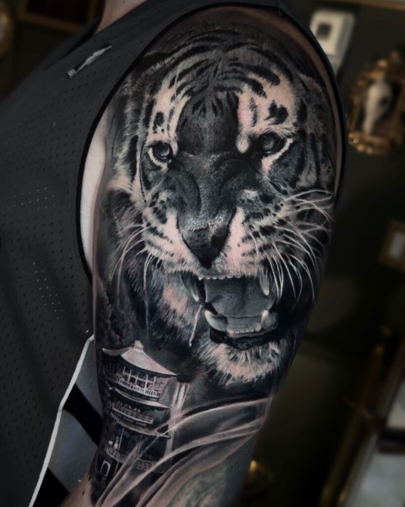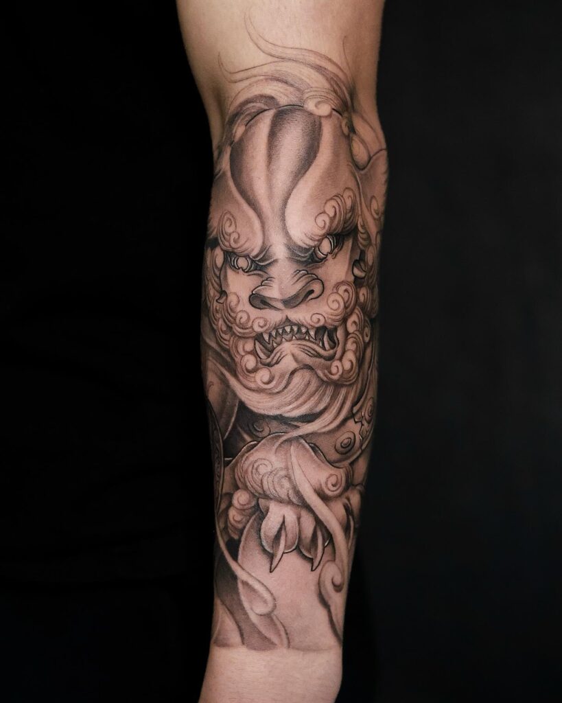 This tattoo symbolizes courage, power, and protection, making it a timeless and striking design.