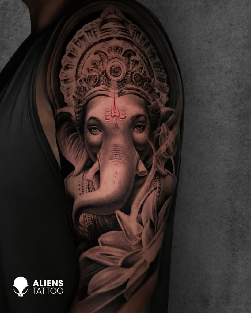 This half sleeve tattoo features Lord Ganesha, detailed with lifelike shading and intricate ornamental elements on the crown.