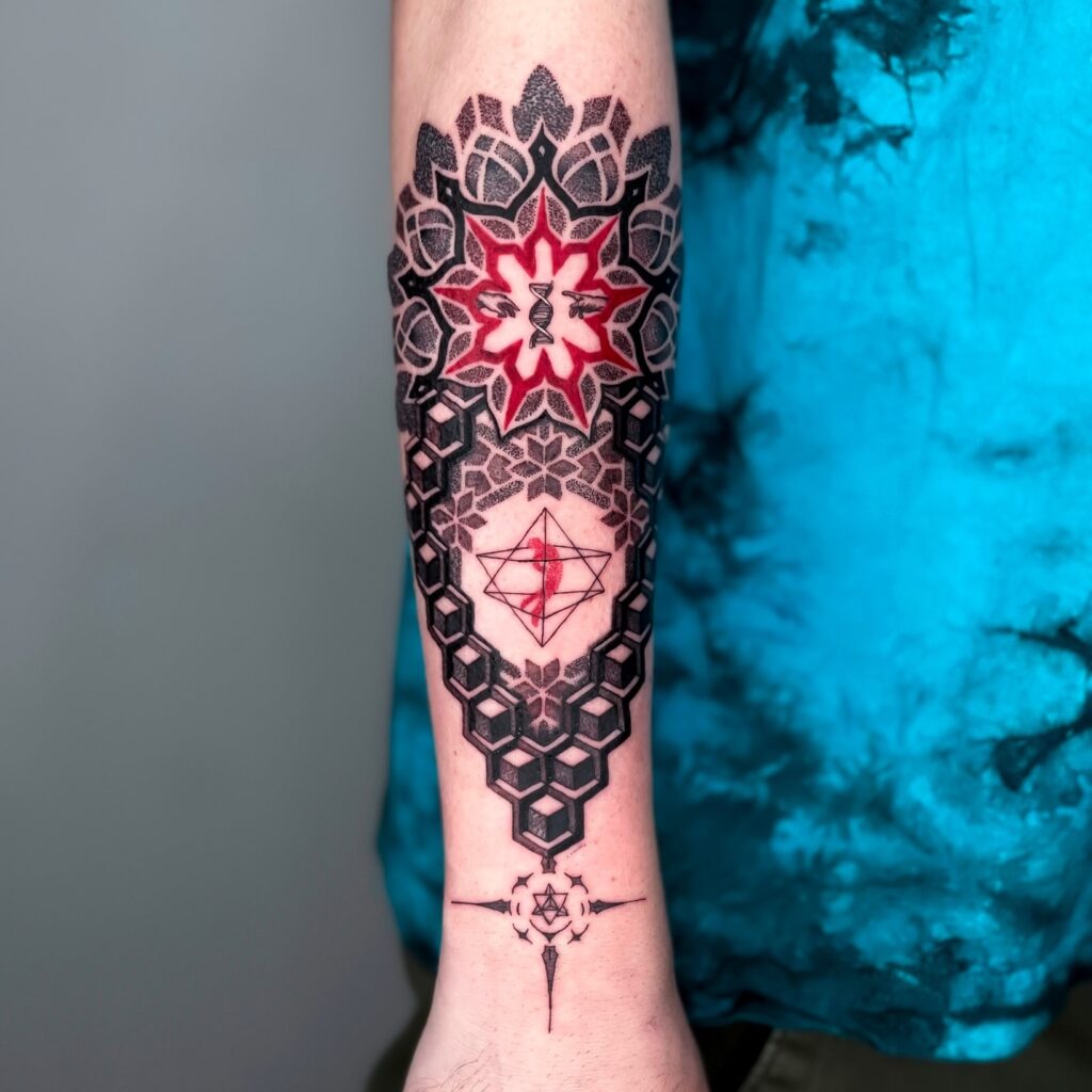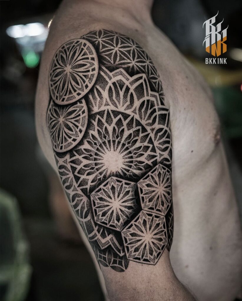 This tattoo represents order, symmetry, and interconnectedness, making it both visually powerful and symbolically rich in meaning.