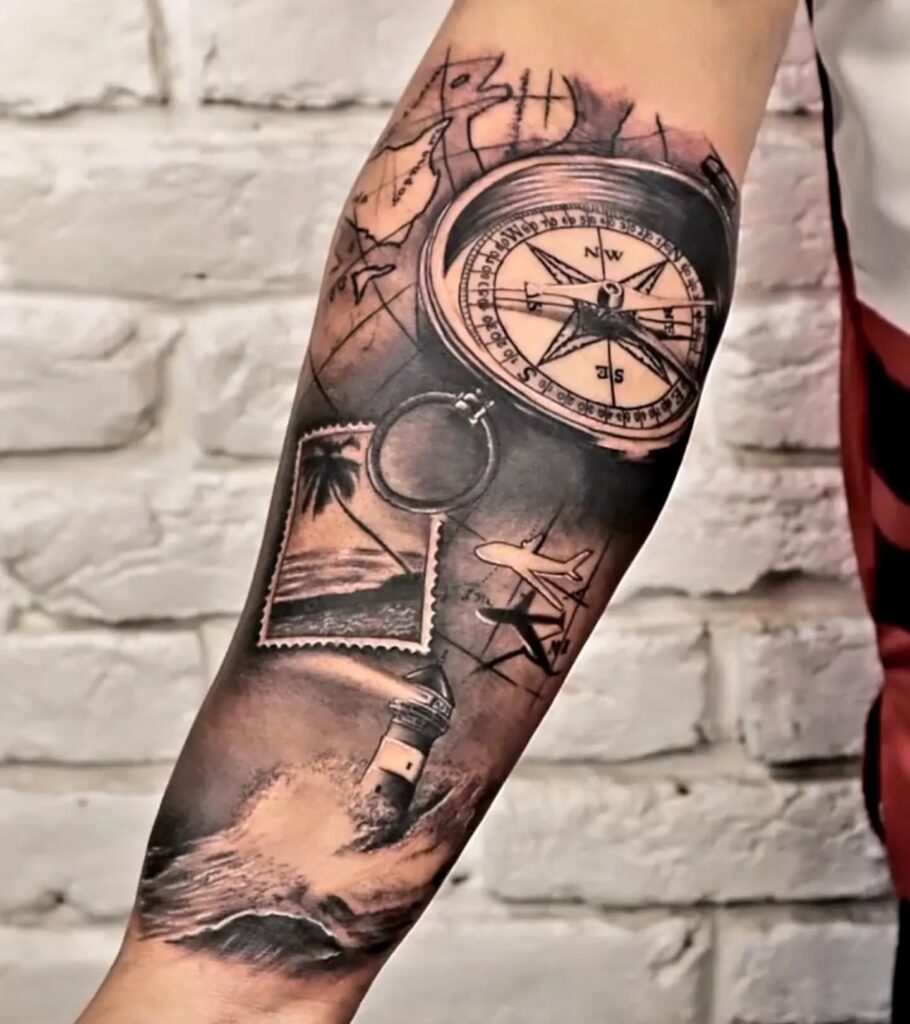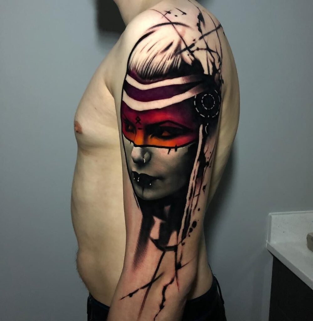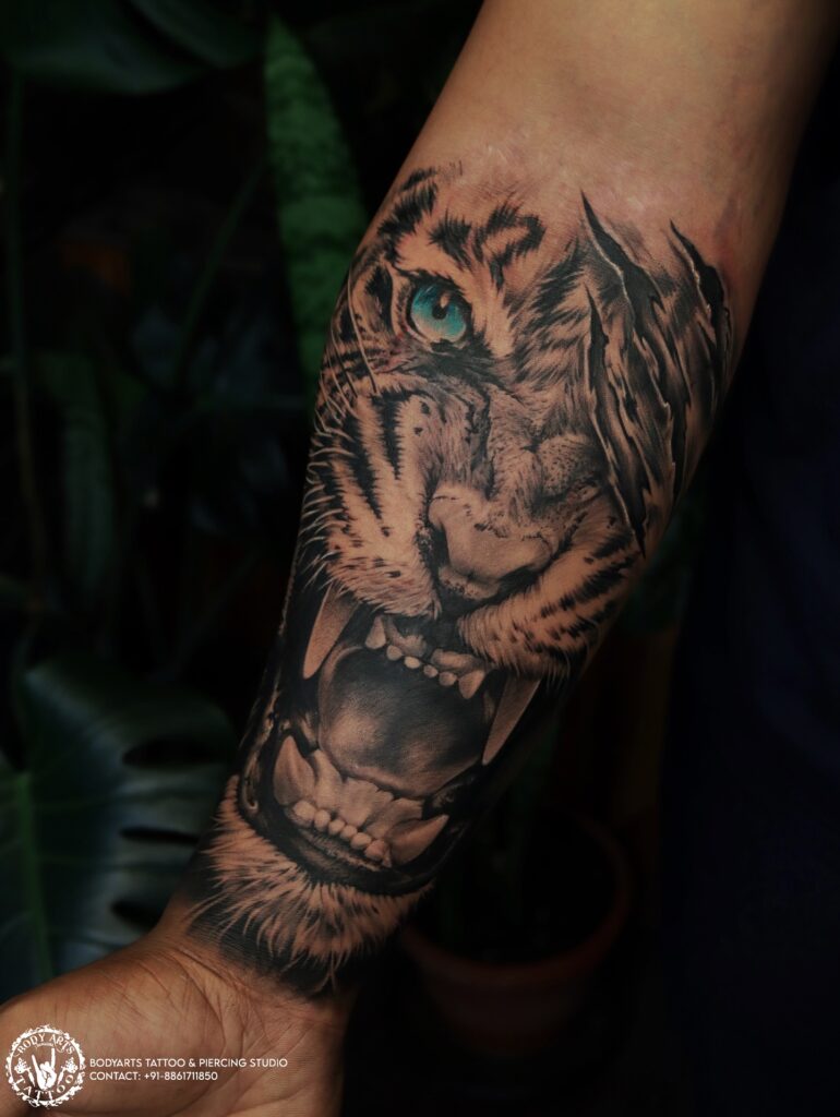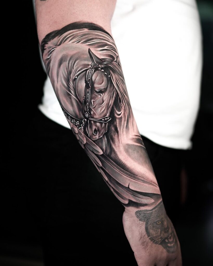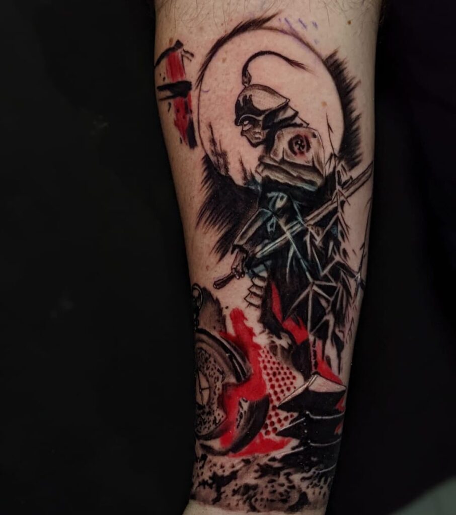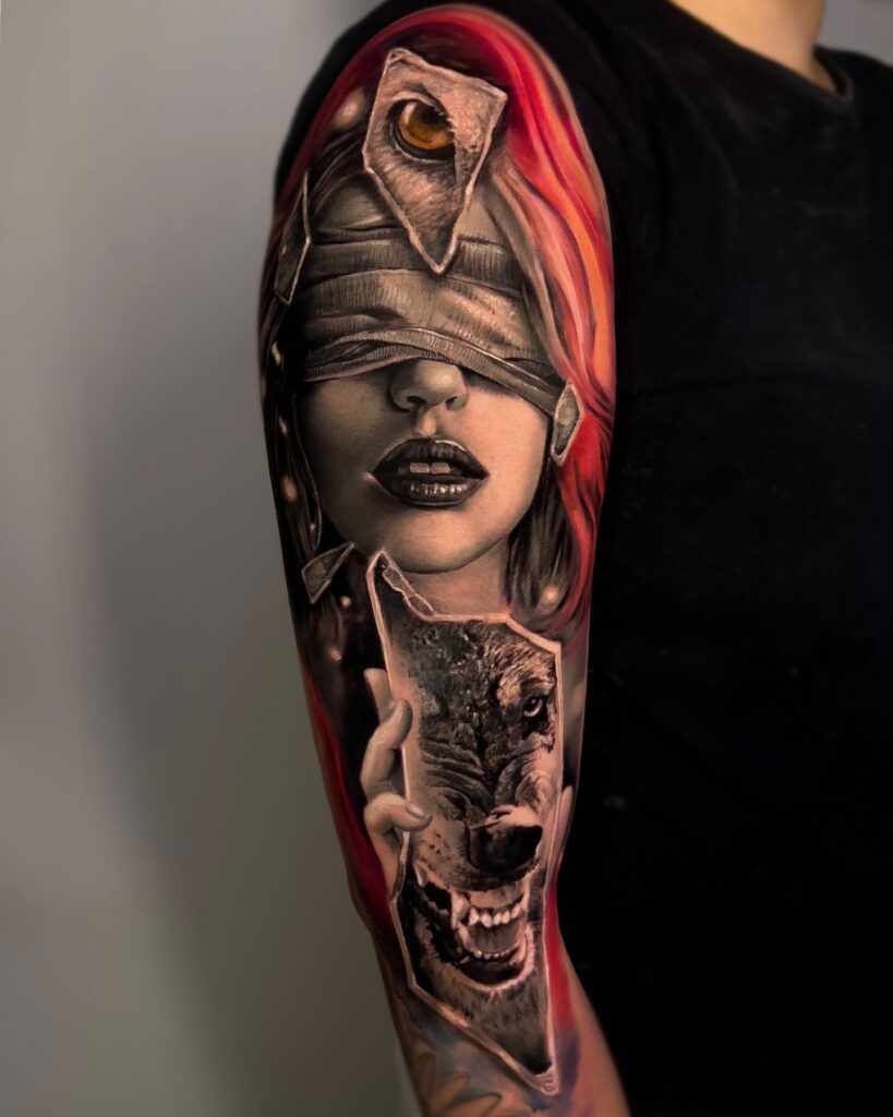 This tattoo merges realism with symbolism, creating a bold and meaningful statement across the arm.