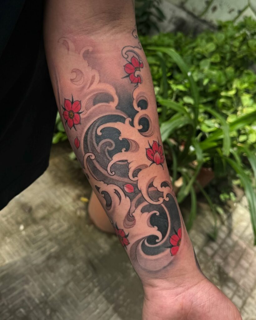 Scattered blossoms add balance and contrast, standing out with bold red petals against the muted waves. The placement flows naturally with the arm’s shape, giving harmony to the design.