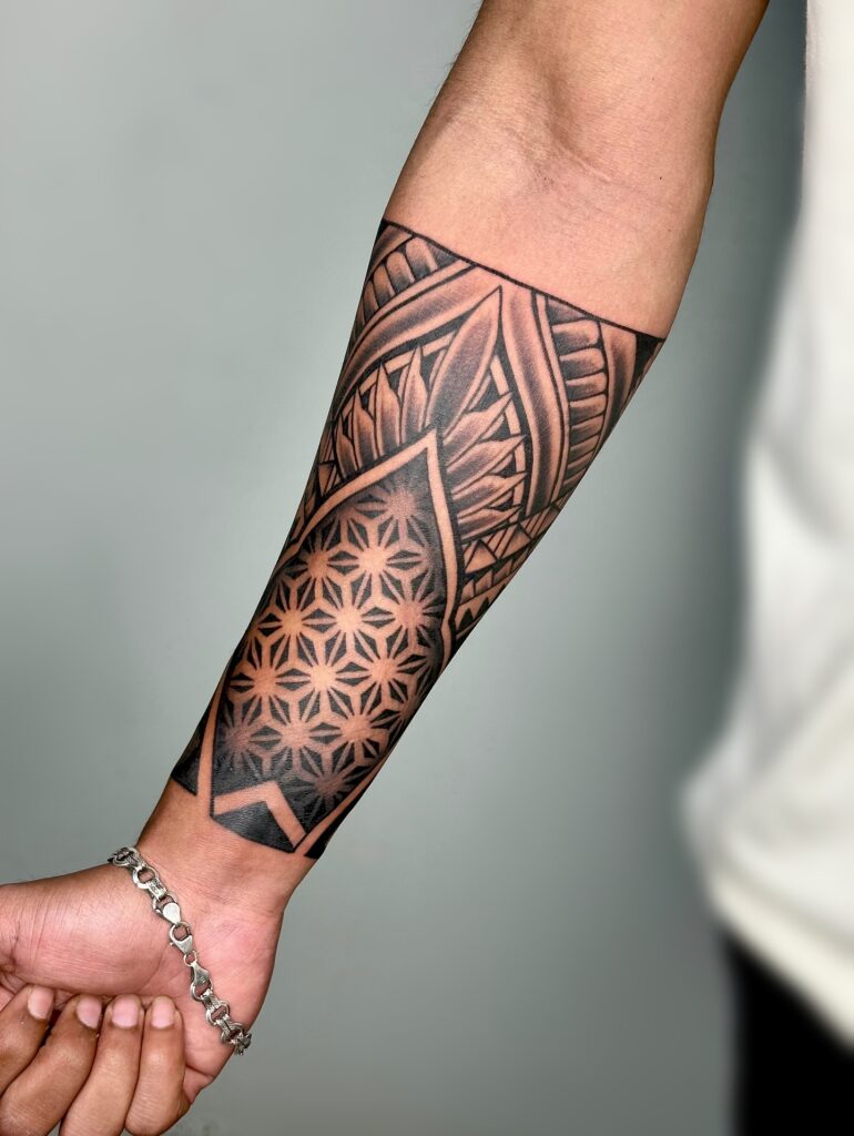 This half sleeve tattoo highlights bold geometric designs that flow seamlessly across the forearm.