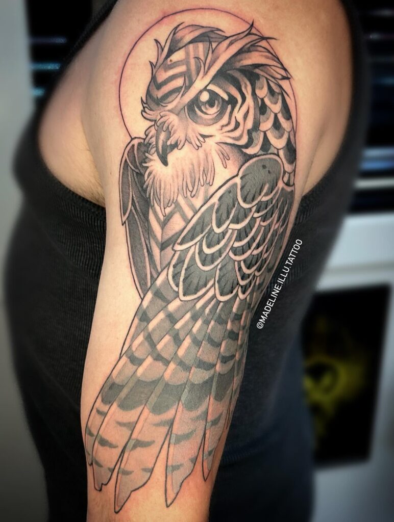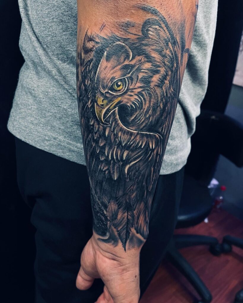 This tattoo blends realism with mythological symbolism, making it a bold piece that embodies strength, wisdom, and divine energy.