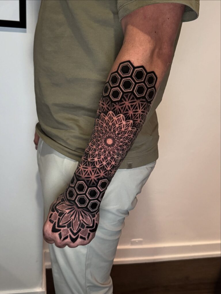 This half sleeve embodies both artistry and precision, making it a powerful expression of geometric and spiritual tattoo work.