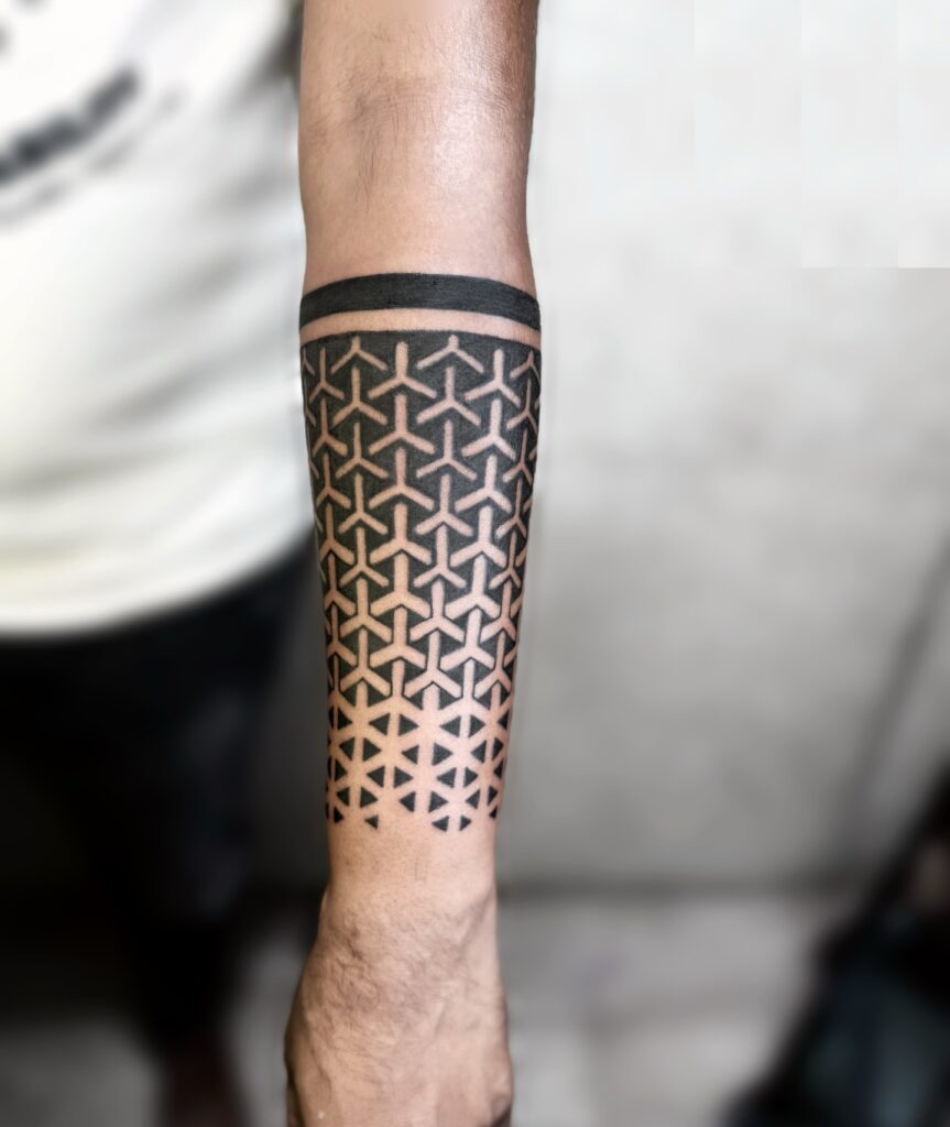Each shape is filled with meticulous dotwork shading, creating texture and contrast against the bold black background. The interconnected patterns form a hypnotic balance between symmetry and complexity, wrapping the arm in a unified design.