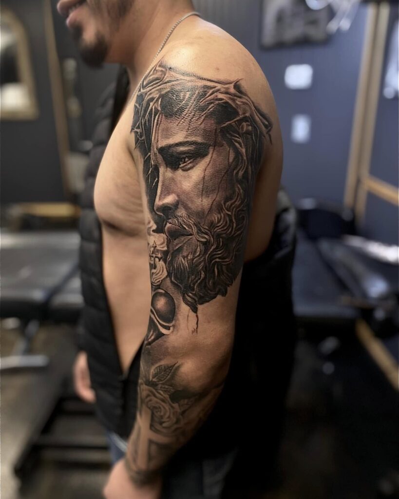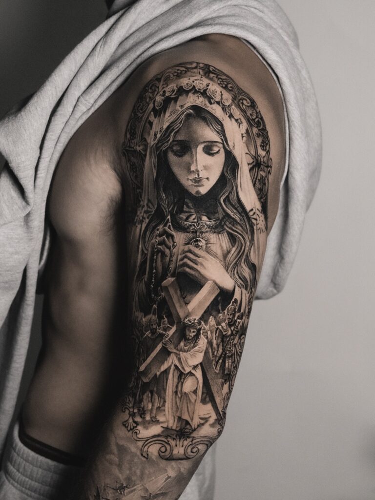 This tattoo represents the struggle between good and evil, capturing themes of faith, resilience, and divine strength in a powerful composition.
