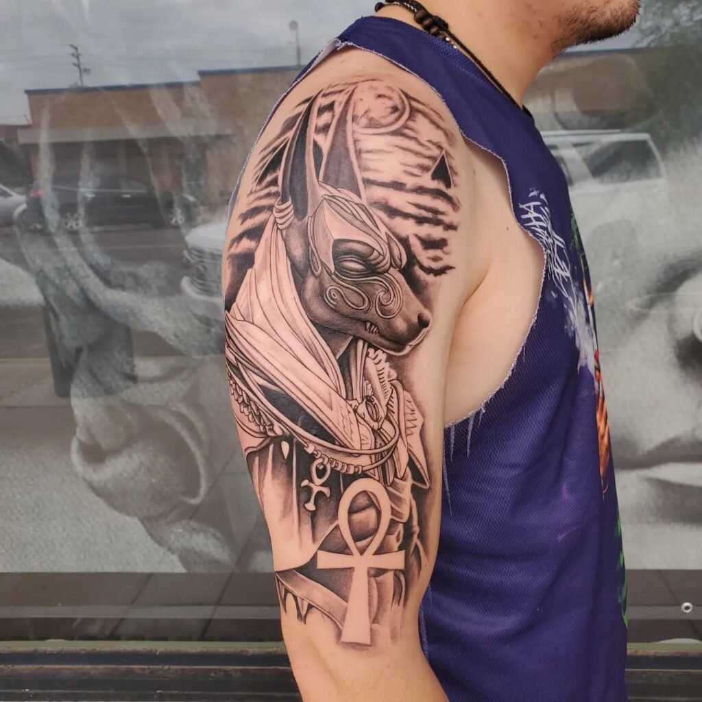 This half sleeve tattoo portrays Anubis, the ancient Egyptian god of the afterlife, in a powerful black and grey design.