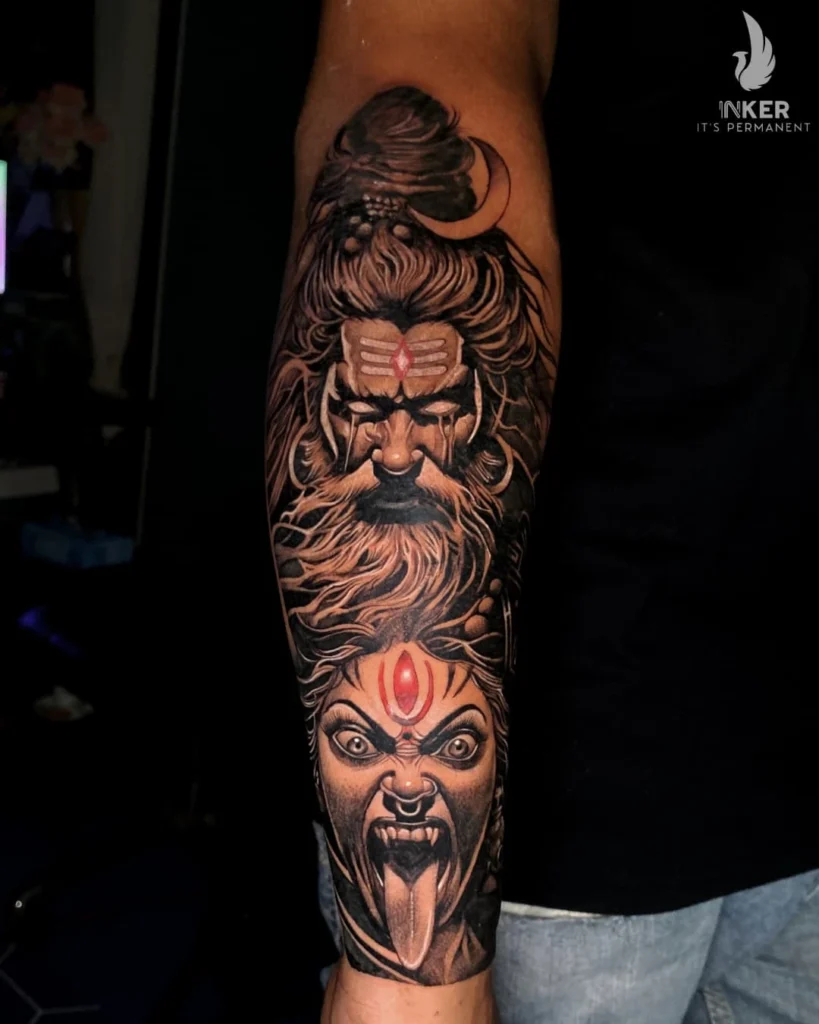 This half sleeve tattoo portrays Lord Shiva and Goddess Kali in a powerful black and grey composition.