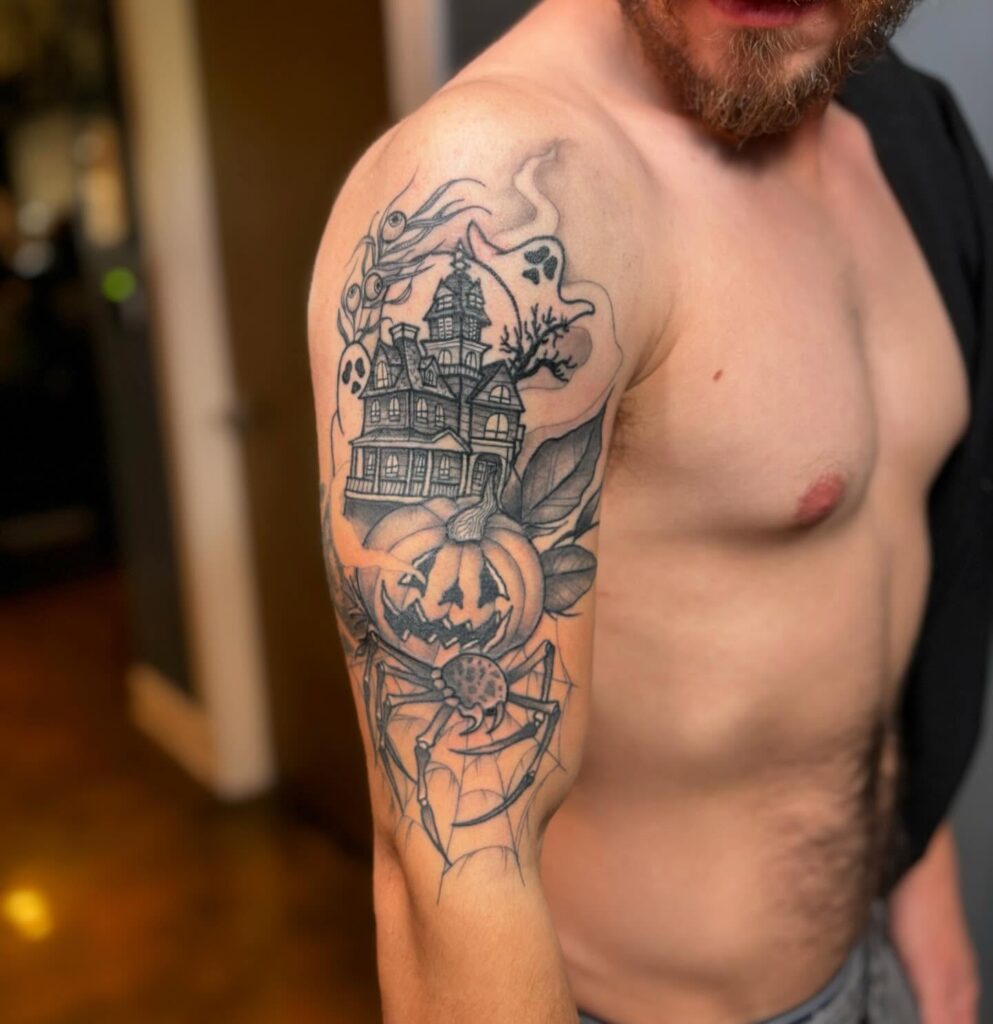 Below, a carved jack-o’-lantern grins menacingly, paired with a spider resting on its intricate web. The design ties together classic horror imagery, haunted house, spirits, pumpkins, and spiders, into a cohesive piece. It balances creepy details with strong linework, making it a striking horror-themed tattoo.