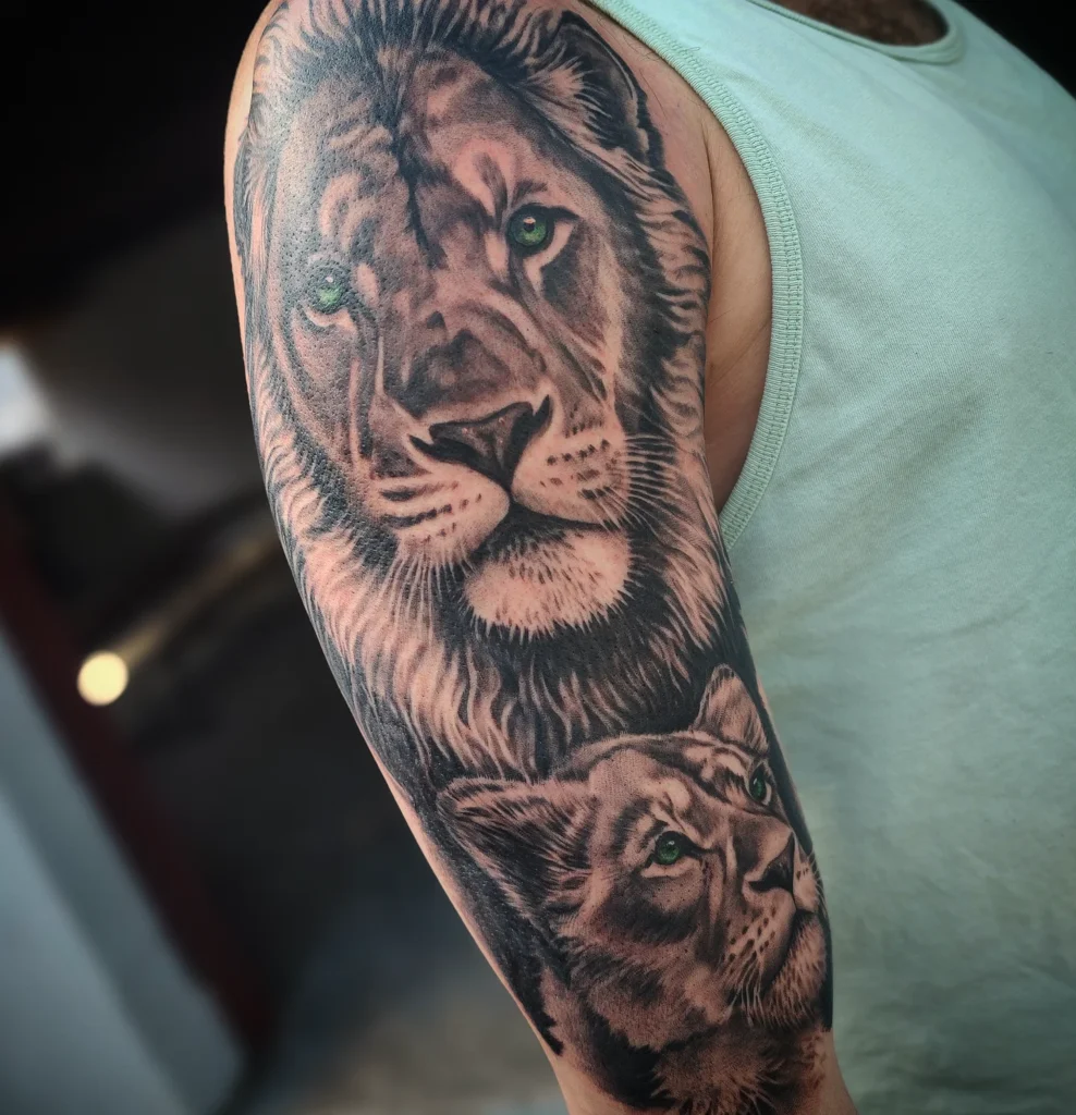 This half sleeve tattoo portrays a majestic lion and lioness, detailed with lifelike shading and piercing green eyes.