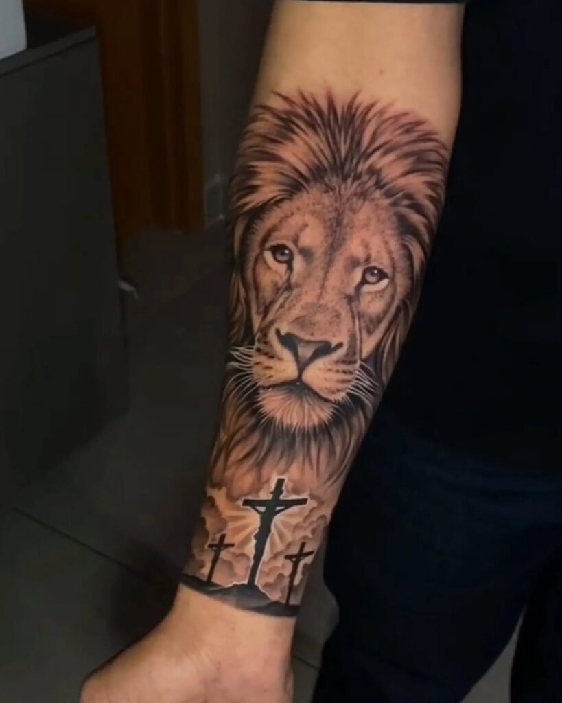 The combination of the lion and crosses connects themes of power, devotion, and redemption, creating a bold tattoo that blends realism with deep symbolic meaning.