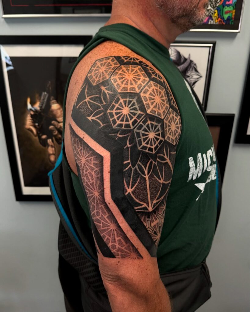 Octagonal shapes filled with intricate linework radiate across the shoulder, creating balance and symmetry.