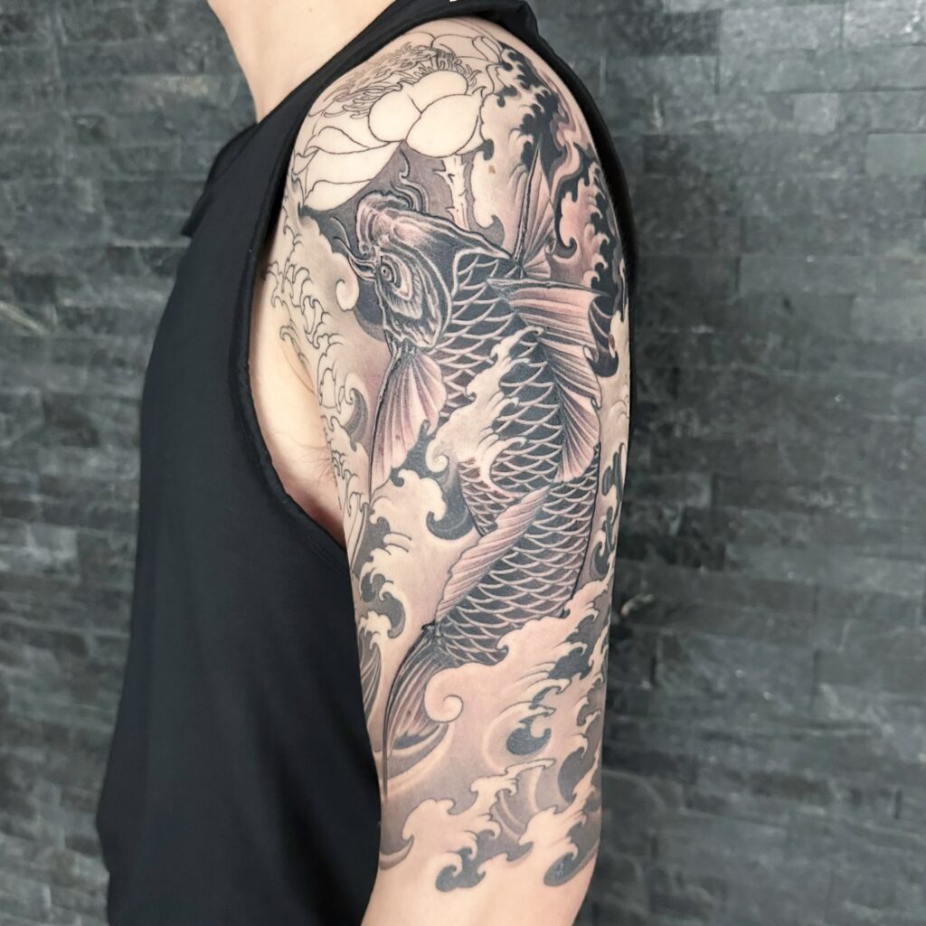 Flowing water elements frame the design, giving movement and balance that extend naturally across the shoulder and arm. Each flower adds warmth, complementing the darker tones of the fish.