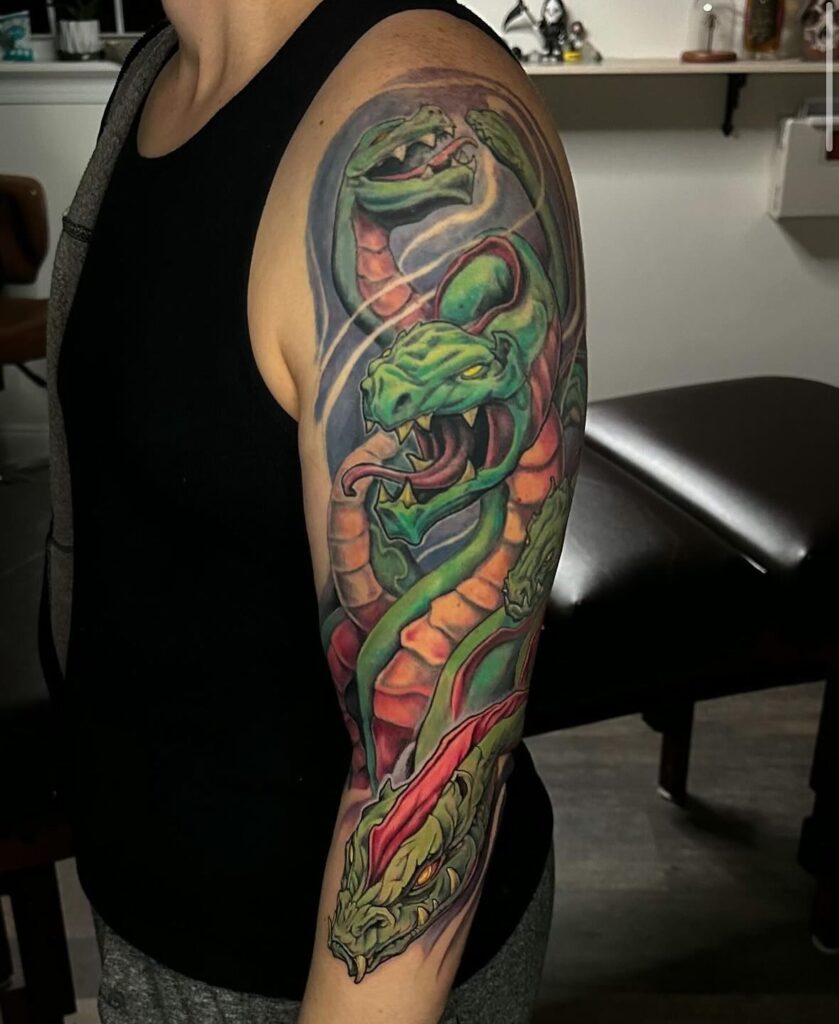 This half sleeve tattoo features a fierce three-headed serpent, illustrated with bold colors and dynamic shading.