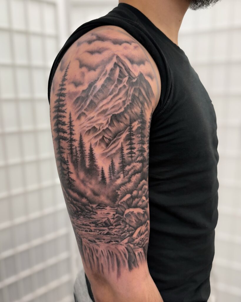 Dark forest silhouettes balance the design, drawing the eye upward toward the mountain’s sharp ridges. The water at the bottom provides movement, giving the tattoo a sense of life and natural rhythm.