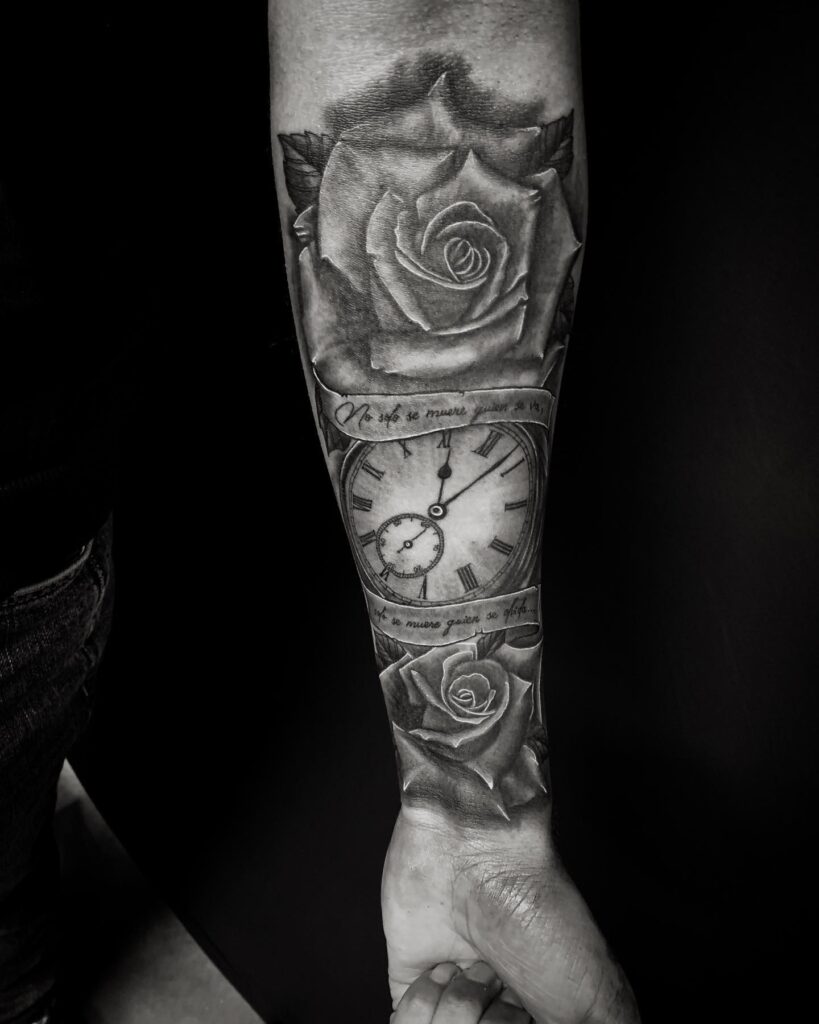 Below it, a mechanical clock with Roman numerals represents the passage of time and life’s fleeting nature. At the base, a rose adds softness, symbolizing love, beauty, and resilience.