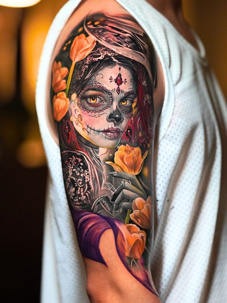 This half sleeve tattoo features a striking Day of the Dead woman surrounded by vivid orange tulips.