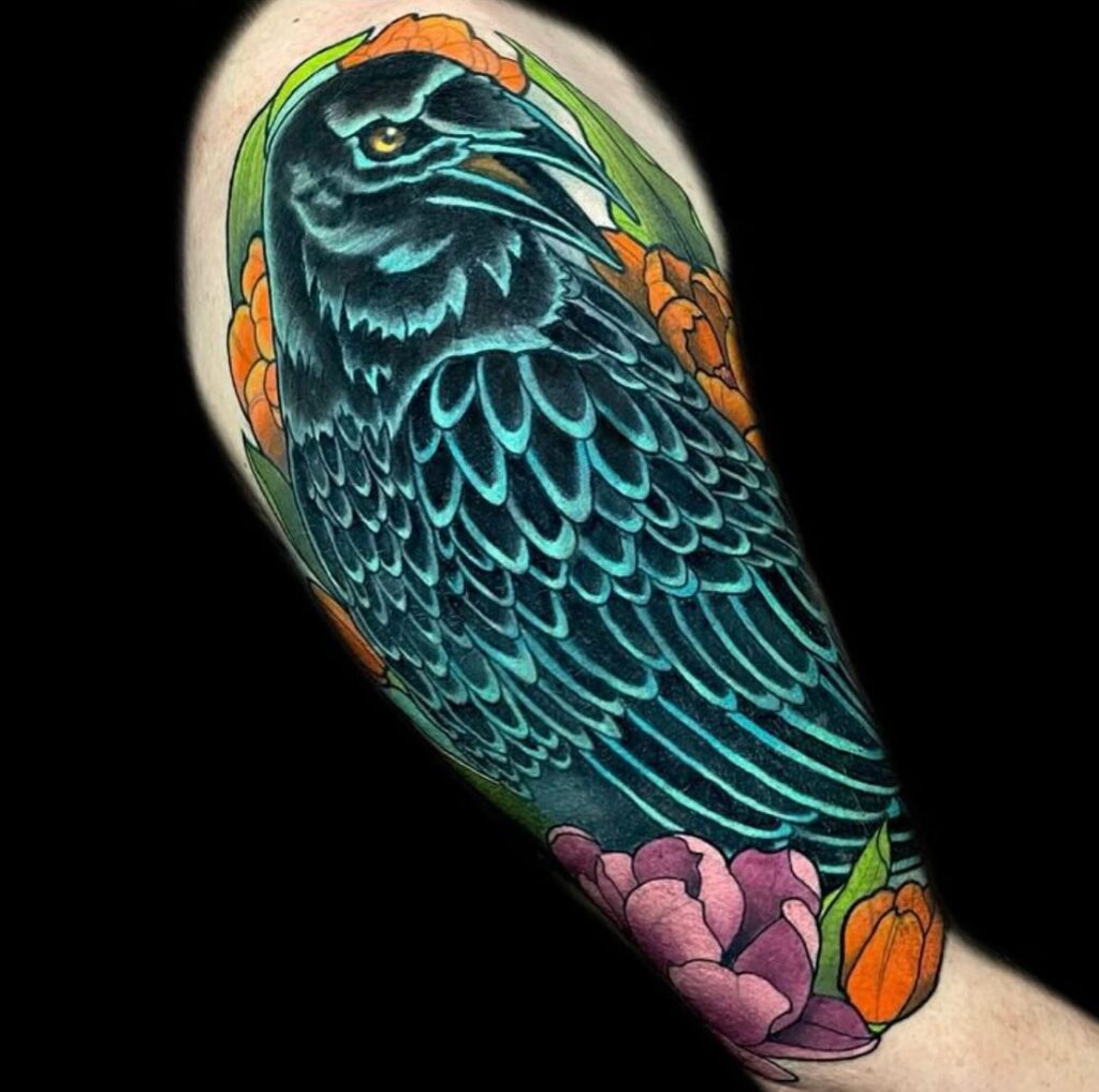 The flowers soften the design, representing renewal, growth, and contrast to the dark bird. Together, they create a powerful balance of light and shadow, wisdom and beauty, making this tattoo both eye-catching and deeply symbolic.