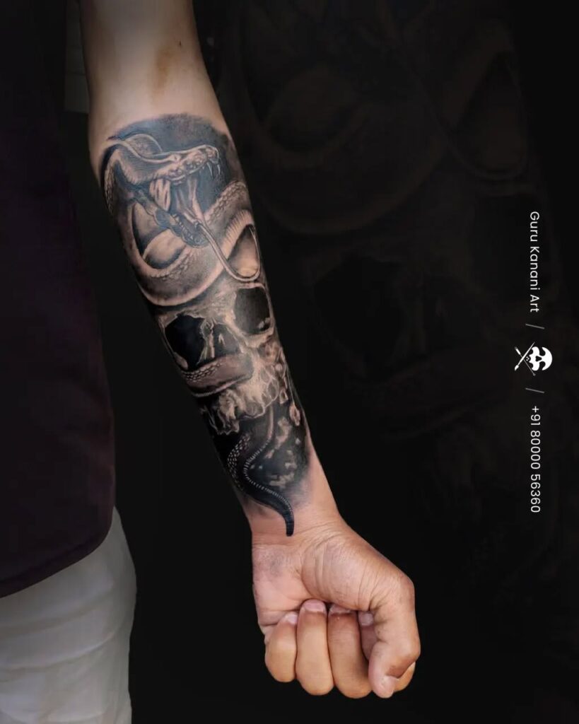 This tattoo symbolizes danger, power, and transformation, reflecting the serpent’s mythological association with strength and resilience. The overall composition is both vivid and commanding.