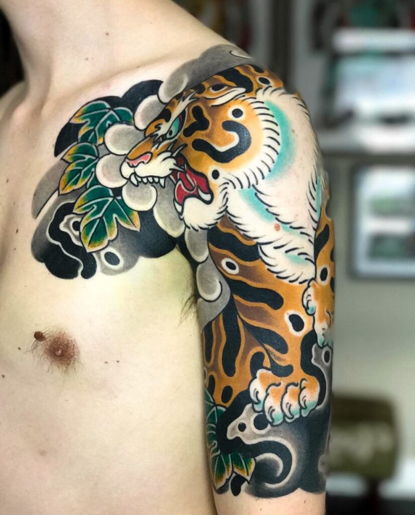 Green leaves and dark swirling clouds frame the design, giving depth and balance across the shoulder and upper arm. The use of solid colors and strong outlines reflects classic Japanese tattoo artistry.