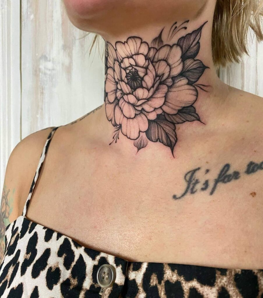 2. Blooming Peony Neck Tattoo with Dotwork Accents