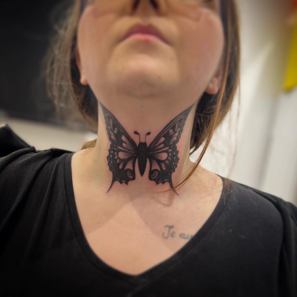 Butterflies often symbolize change, resilience, and rebirth—when placed on the throat, it can also represent finding your voice or personal transformation. This piece is fearless and commanding, perfect for someone who embraces both strength and metamorphosis with confidence and grace.
