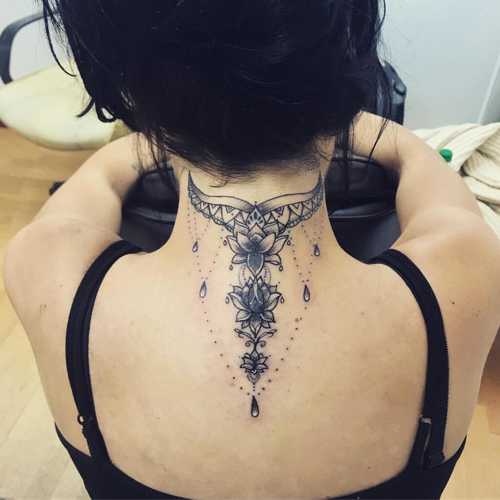 This captivating tattoo features two blooming lotus flowers stacked vertically down the back of the neck, surrounded by intricate dotwork and ornamental elements. Teardrop-shaped jewels hang like delicate charms, giving the piece a luxurious, almost regal quality.