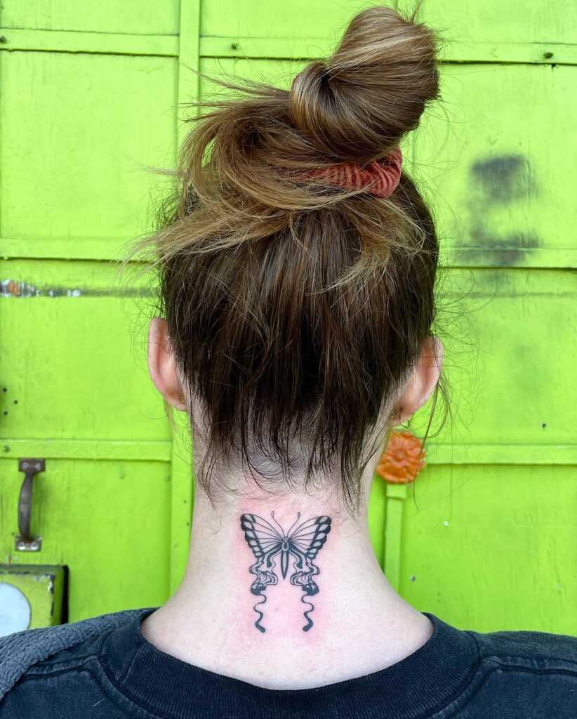 This stunning neck tattoo features a black-lined butterfly with long, decorative lower wing extensions that give it a unique, artistic twist. Centered at the nape, the butterfly symbolizes transformation, freedom, and beauty.