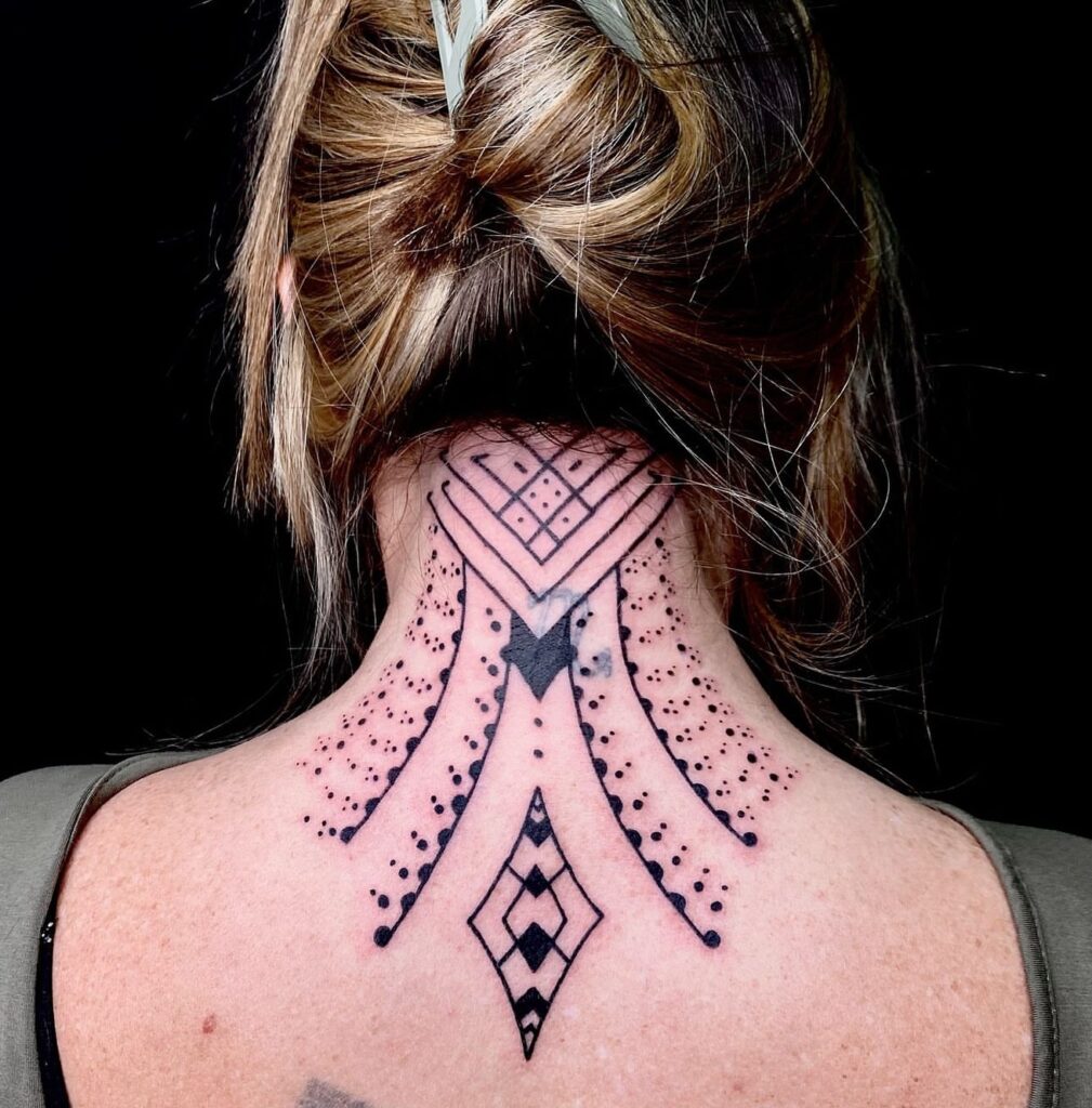 This bold and structured tattoo features a geometric pattern cascading down the back of the neck in an arrow-like formation. Sharp diamonds, dotted trails, and angular linework give it a tribal or ritualistic feel, while the symmetry adds balance and intention.