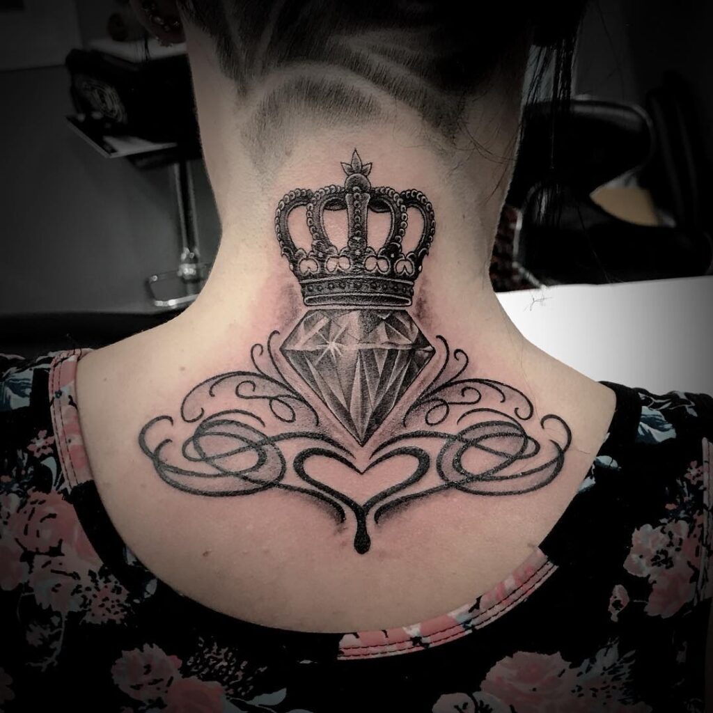 This regal tattoo design showcases a large, intricately shaded diamond crowned with a detailed royal tiara, sitting proudly at the back of the neck. Surrounding it are elegant swirls and a soft heart shape, adding a flourish of femininity and strength.