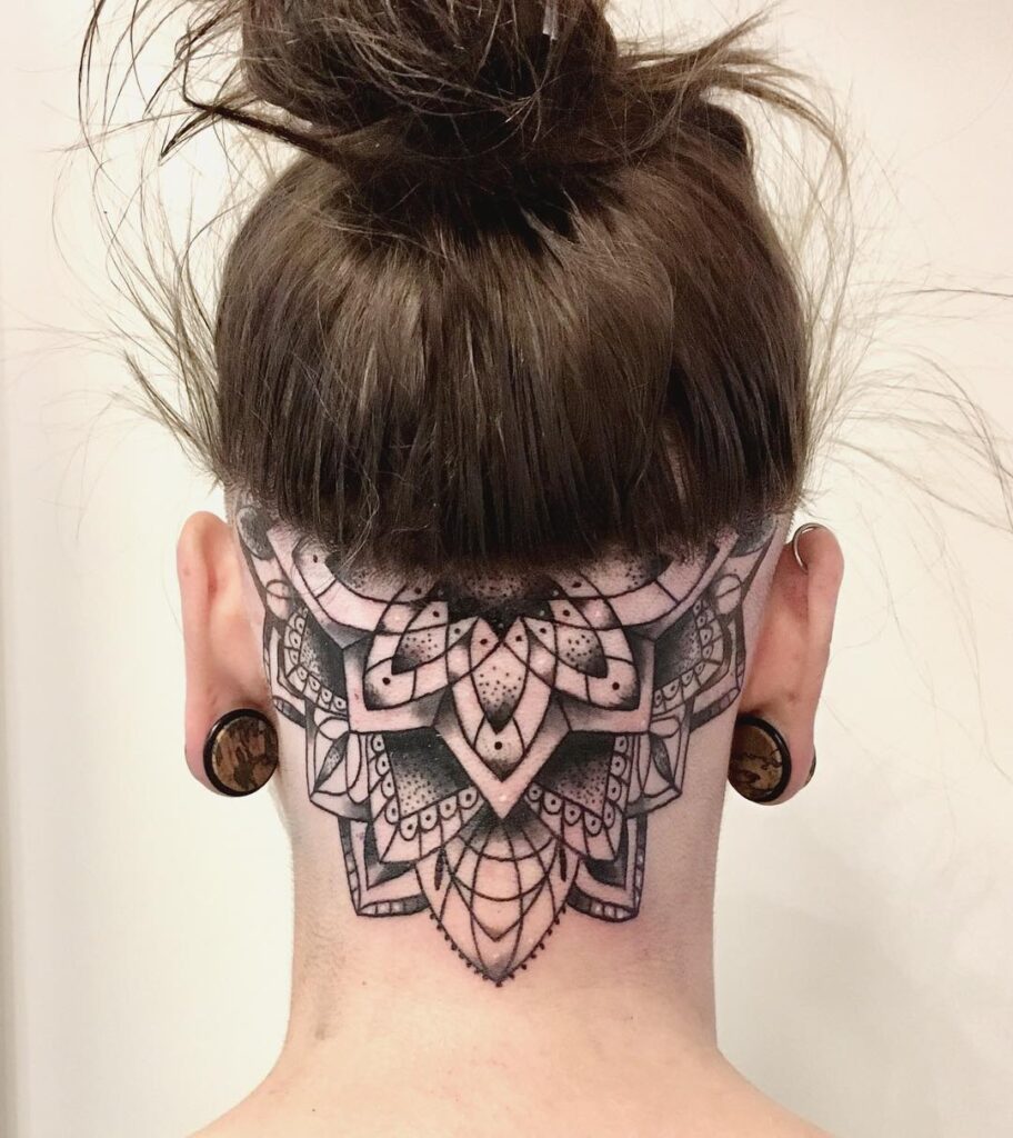 This striking tattoo features a large mandala-inspired design placed perfectly on the back of the neck and flowing into the hairline. Intricate layers of geometric petals, dotwork, and fine line detailing create a symmetrical pattern full of depth and balance.