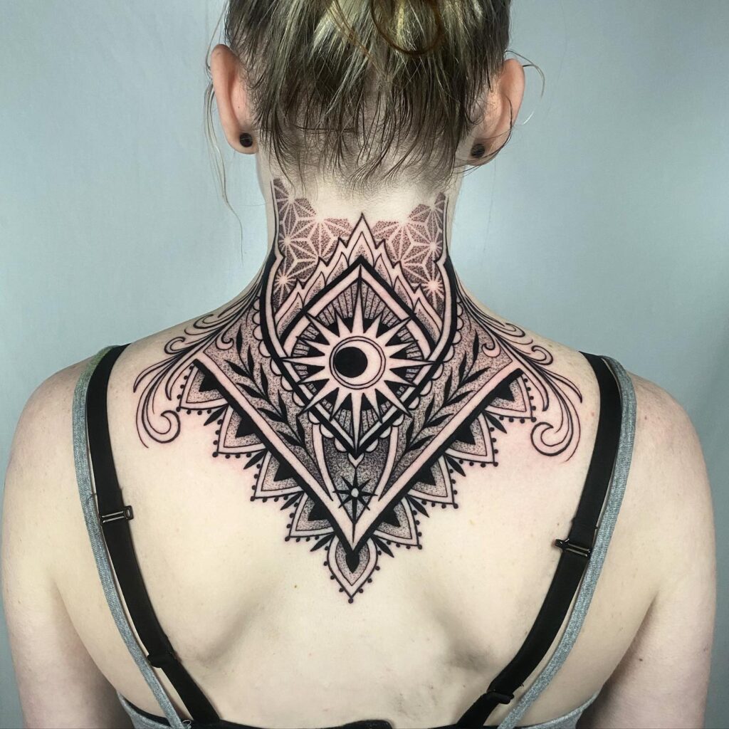 This breathtaking tattoo covers the back of the neck and upper back with a bold fusion of sacred geometry, a radiant sunburst, and ornate linework.