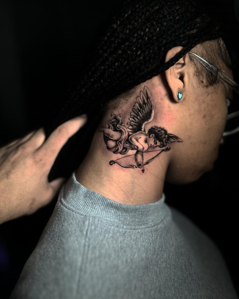This beautifully detailed neck tattoo features a classic depiction of Cupid, the winged cherub of love, aiming his bow and arrow.