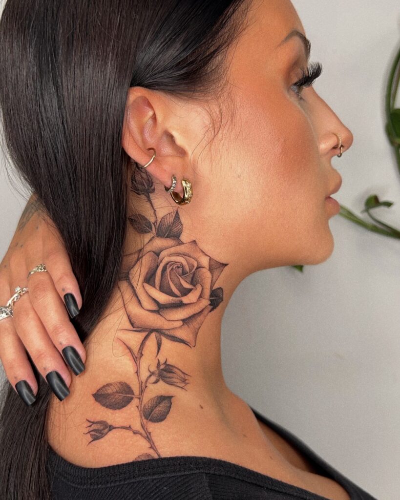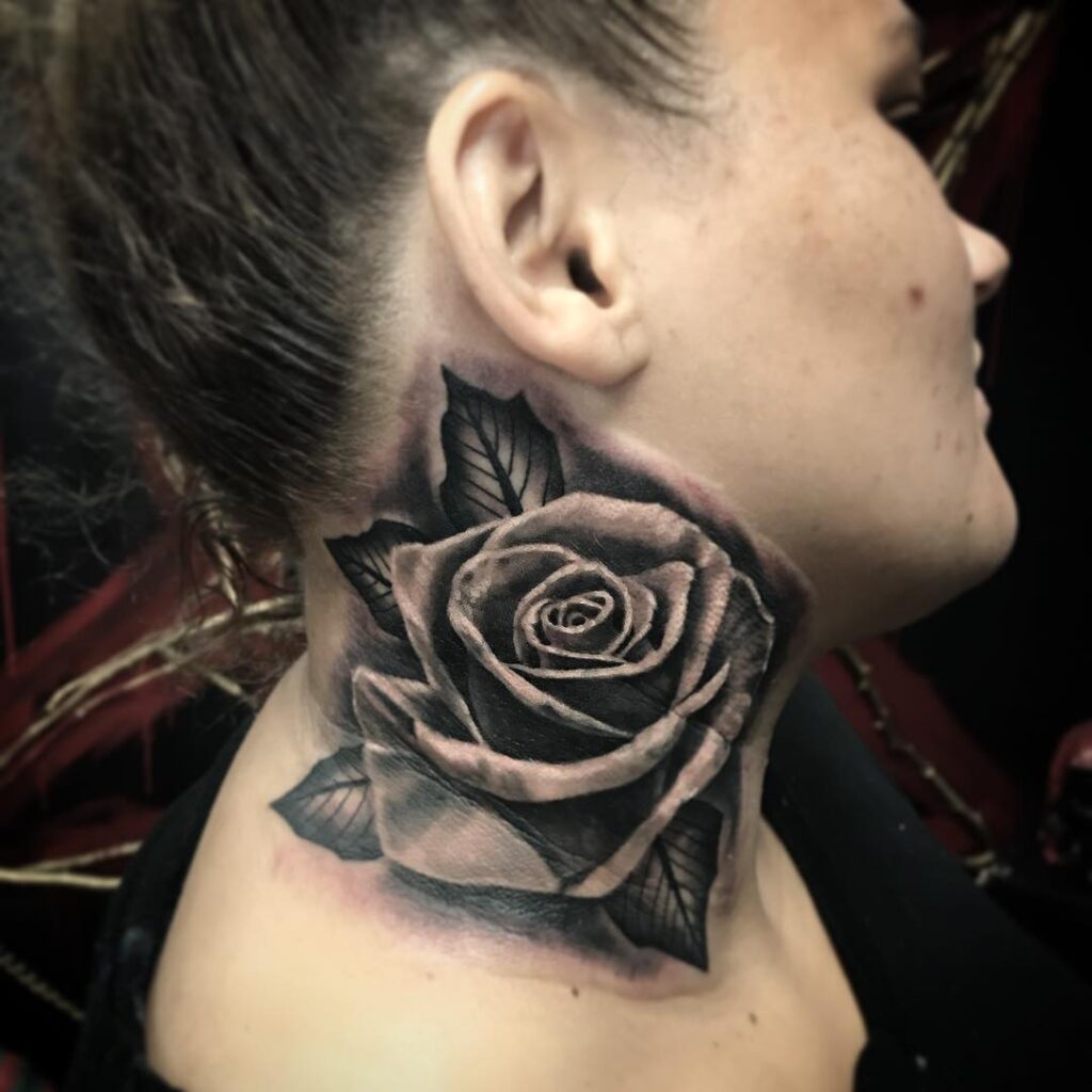 This breathtaking neck tattoo features a large, hyper-realistic rose shaded in smooth gradients of black and grey. The petals are soft and layered, creating depth and dimension, while the surrounding leaves add structure and flow.
