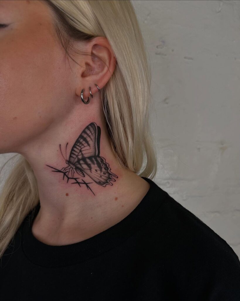 This graceful side neck tattoo features a black and grey butterfly with gently shaded wings and clean, elegant linework. The design appears delicate yet confident, symbolizing transformation, freedom, and personal growth.