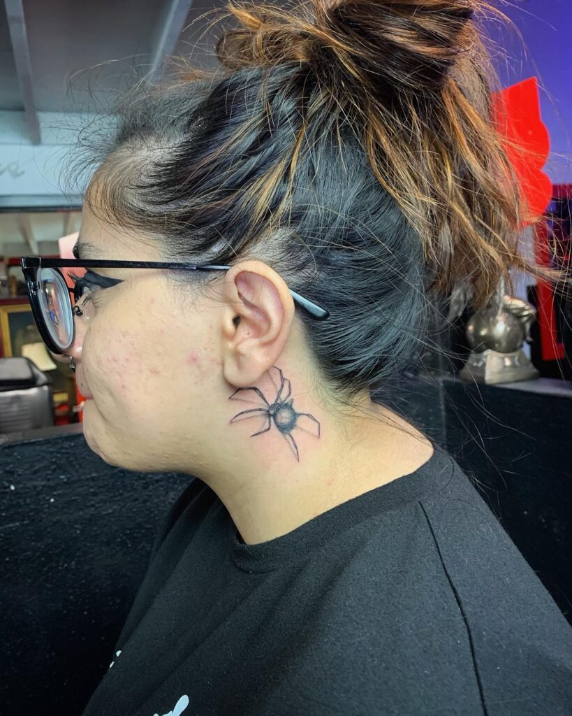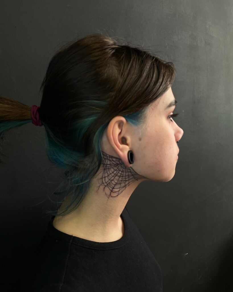 This edgy neck tattoo features a finely detailed spider web stretching from just behind the ear down to the base of the neck. The delicate, symmetrical lines curve naturally with the contours of the neck, creating a look that’s both striking and stylish.
