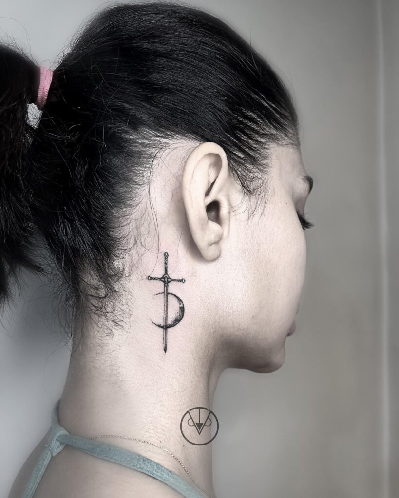 The symmetry and clean lines give it a delicate yet intentional feel. Subtle enough to keep personal, yet perfectly placed to be seen when hair is up, this tattoo is ideal for someone who loves soft symbolism and meaningful simplicity.
