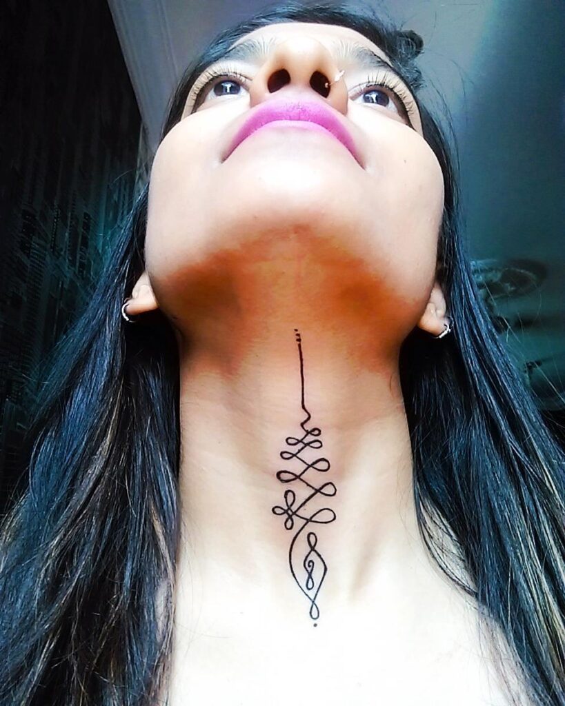 This elegant throat tattoo showcases a vertical Unalome symbol—a spiritual design that represents the journey toward enlightenment. The winding lines reflect life’s path, with its twists, turns, and learning curves, eventually leading to harmony and clarity at the top.