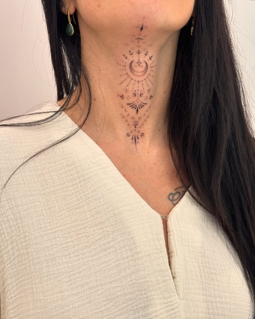 This elegant neck tattoo features a central crescent moon surrounded by delicate ornamental elements and fine dotwork, creating a sense of cosmic alignment. The symmetrical design flows vertically along the throat, with soft lines, dots, and small shapes that resemble sacred geometry.