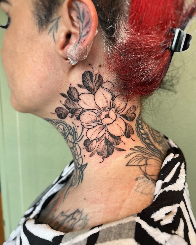 The inky shading adds depth and movement, as if the artwork is blooming upward along the neck. It’s a perfect blend of strength and style, offering a refined alternative to traditional floral designs. Ideal for someone who values art, balance, and individuality, this tattoo stands out with its dramatic placement and sophisticated aesthetic.