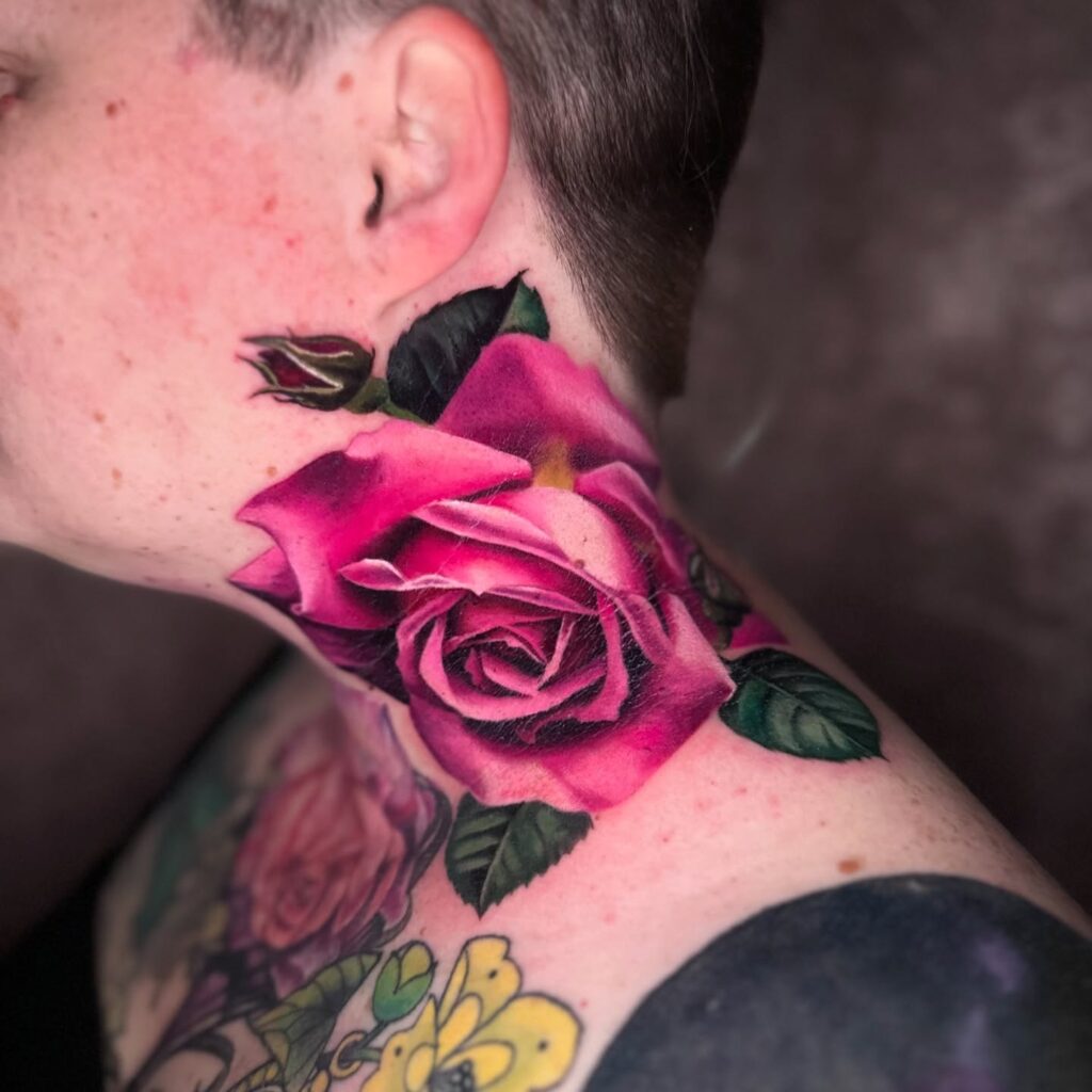 This eye-catching neck tattoo features a large, hyper-realistic pink rose in full bloom, accented with lush green leaves and a delicate rosebud near the ear. The vibrant shades of magenta and deep fuchsia create stunning contrast against the skin, giving the petals a velvety, lifelike appearance.