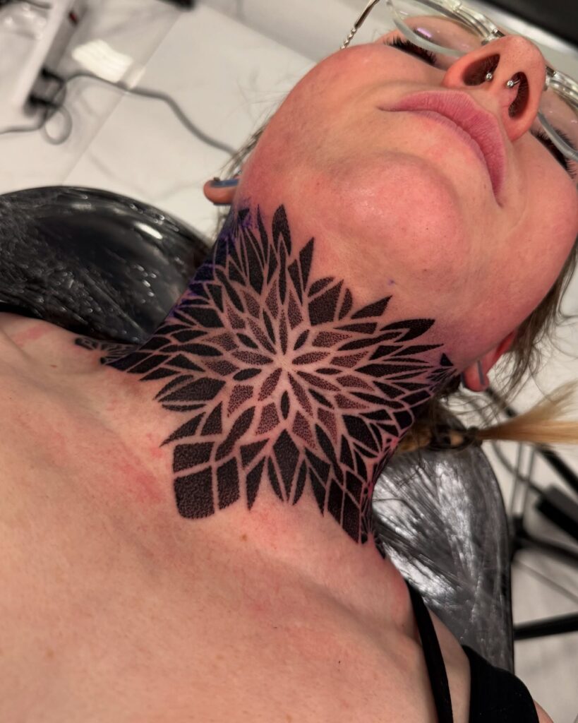 This striking throat tattoo features a bold geometric mandala that radiates outward in layered petal-like shapes. Expertly shaded in solid black ink, the design uses negative space to create symmetry and contrast, giving it a powerful, dimensional appearance.