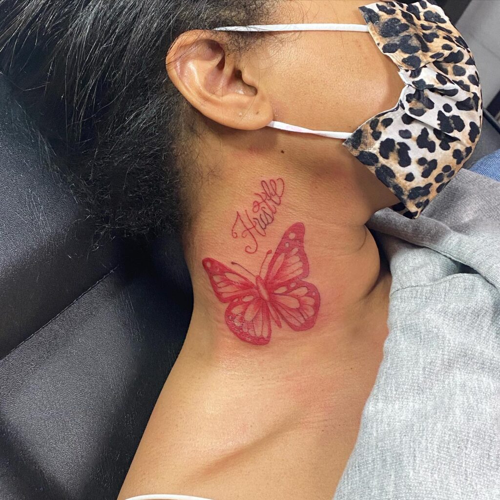 This vibrant neck tattoo features a bold red butterfly with soft shading and elegant wing patterns. Above it, the word “Hustle” is written in graceful script, echoing a message of determination and ambition.