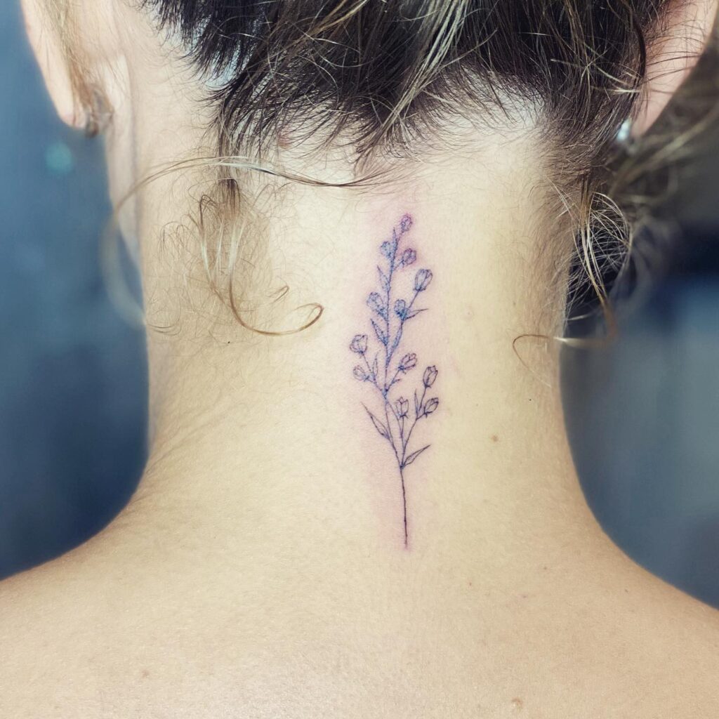 This dainty back-of-neck tattoo features a single wildflower stem with tiny, budding blooms rendered in fine lines and soft violet hues. The simplicity of the design gives it a quiet, graceful presence, perfect for those who appreciate nature’s subtle beauty.